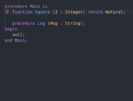 Go to Definition now jumps respectively on the begin, private and body keywords for subprograms, packages and tasks when clicking on the is keyword following their declarations.